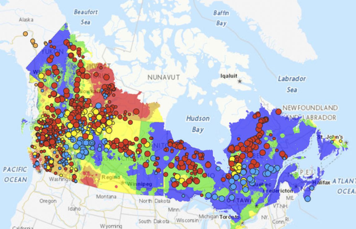 ކެނެޑާގައި ރޯވެ އަނދަމުންދާ ސަރަޙައްދުތައް ދައްކުވައިދޭ ޗާޓެއް.