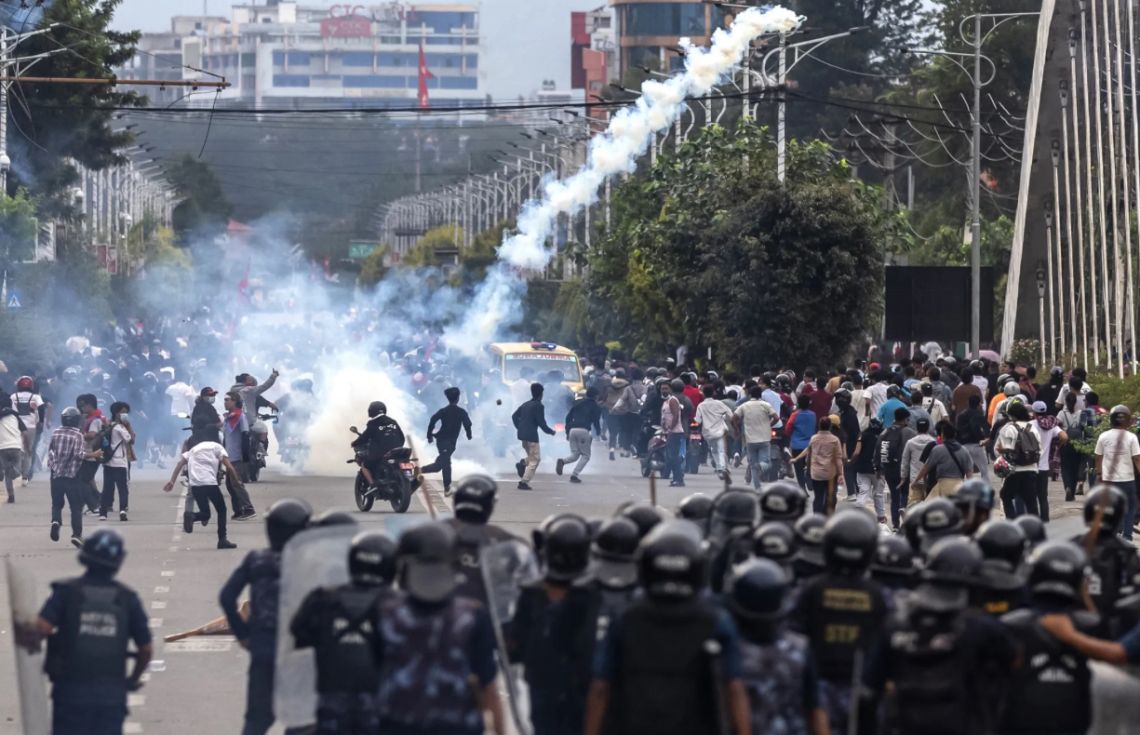 ސެޕްޓެމްބަރު 8 ވަނަ ދުވަހު ކަތުމަންޑޫގައި ކުރިޔަށްދިޔަ މުޒާހަރާ ރޫޅާލުމަށް ނޭޕާލްގެ ސަލާމަތީ ބާރުތަކުން ކަރުނަ ގޭސް ބޭނުން ކުރަނީ / ފޮޓޯ: އޭއެފްޕީ