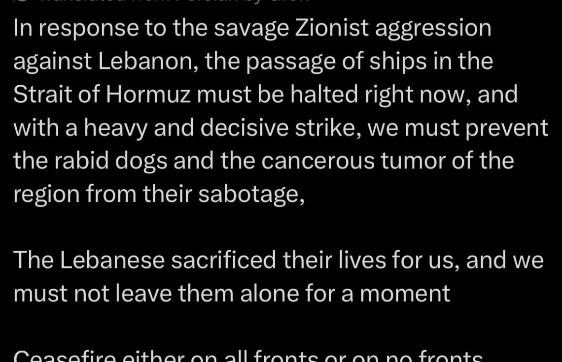 ލުބުނާނަށް ޙަމަލާ ދޭނަމަ ހުރްމުޒް ބަންދުކޮށްލައި ހަނގުރާމަ އަލުން ފަށަން ޖެހިދާނެ ކަމުގެ ނުސީދަ އިންޒާރެއް އީރާނުން ދީފިއެވެ. އީރާނުގެ ރައްޔިތުންގެ މަޖިލީހުގެ ޤައުމީ ސަލާމަތާއި ބެހޭ ކޮމިޝަނުގެ ތަރުޖަމާނު ވިދާޅުވީ ލުބުނާނަށް ޙަމަލާ ދެމުންދާ ޒަޔަނިސްޓުންގެ ސަބަބުން ހަ ގުރާމަ ހުއްޓާލުމުގެ އެއްބަސްވުމަށް ޢަމަލު ނުކުރަން ޖެހިދާނެ ކަމަށެވެ. އޭނާ އިޒުރޭލުގެ ދައުލަތް ސިފަ ކުރެއްވީ މެދުއިރުމަތީގައިވާ މޮޔަ ބަލި ޖެހިފައިވާ ކުއްތާއެއްގެ ގޮތުގައެވެ. އަދި ވިދާޅުވީ އެއީ އެ ސަރަޙައްދުގައި ކެންސަރު ބަލި ފަތުރާ ޓިއުމަރެއް ކަމަށެވެ.