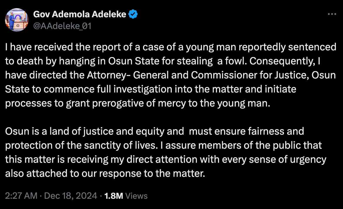 އޮސުން ސްޓޭޓްގެ ގަވަރުނަރު އަޑެމޯލާ އަޑެލޭކޭ ވަނީ މަޢާފުގެ މަރުޙަލާ ފެށުމަށް ނައިޖީރިއާގެ ކޮމިޝަނަރު ފޯ ޖަސްޓިސްއަށް އަންގާރަ ދުވަހު އަންގާފަ އެވެ.